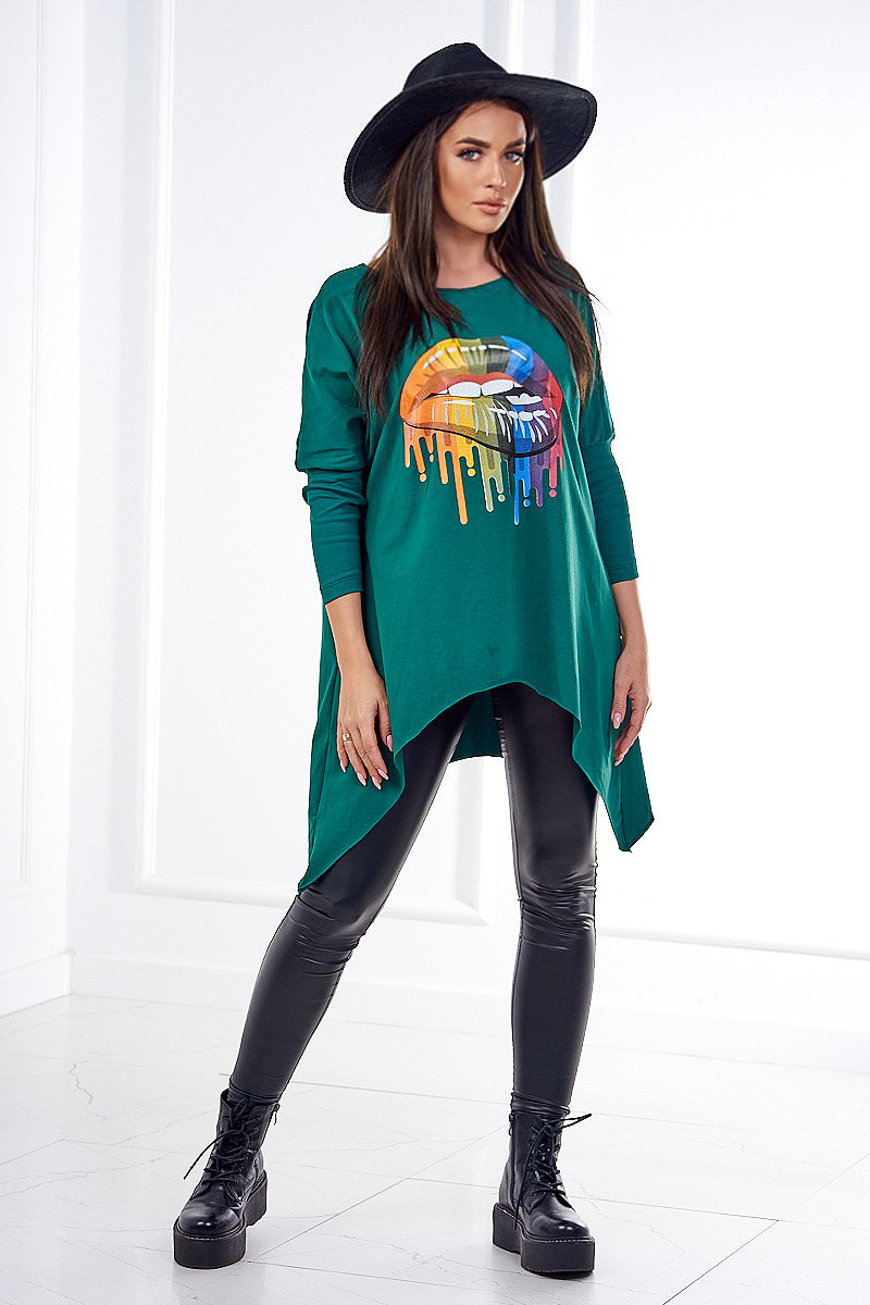 Prezentujemy Państwu super bluzkę oversize. Bluzka posiada nadruk z przodu przedstawiające usta w kolorze tęczy. Bluzka z kieszeniami. Bluzka ta charakteryzuje się modnym wyglądem i precyzją wykonania. Na pewno nie może jej zabraknąć w Twojej szafie. Bluzka wykonana jest z wysokiej jakości materiału. Rozmiar uniwersalny będzie odpowiedni dla Pań noszących na co dzień ubrania w rozmiarze M, L lub XL