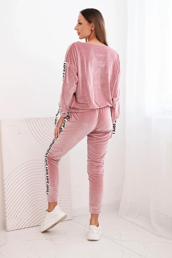 Prezentujemy Państwu komplet bluzy i spodni. Komplet wykonany z weluru. Bluza posiada taśmy z napisem Love. Spodnie z kieszeniami oraz wiązanie w pasie. Bardzo modny i stylowy komplet. Komplet wykonany jest z wysokiej jakości materiału. Rozmiar jest uniwersalny i będzie odpowiedni dla Pań w rozmiarze S, M lub L.