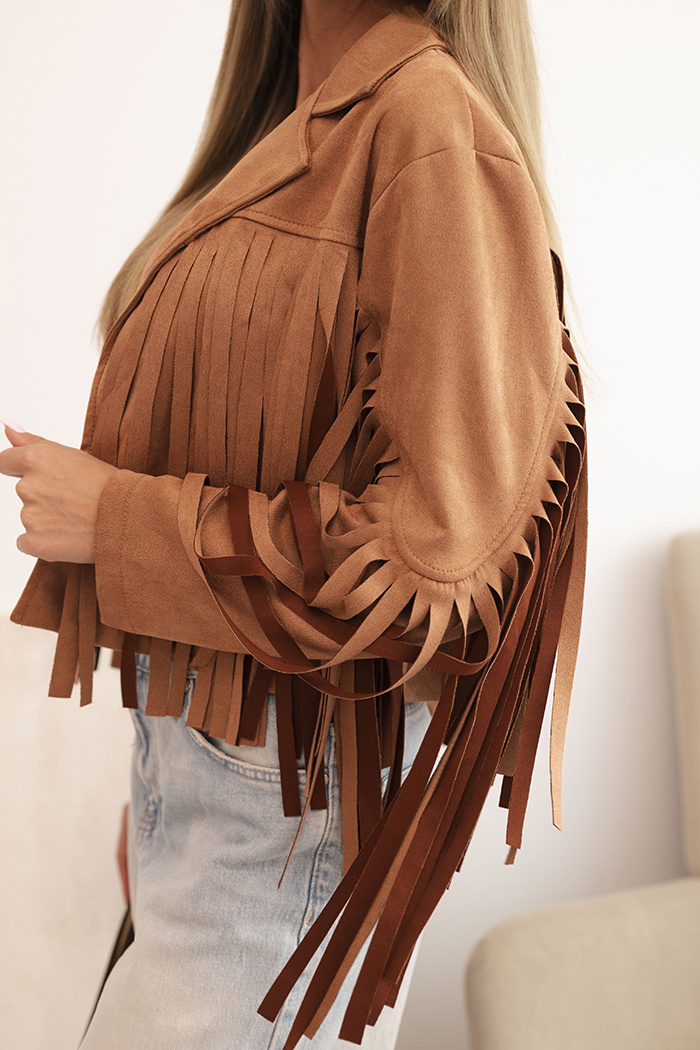 Kurtka damska z frędzlami to wyjątkowy model, który przyciąga spojrzenia i dodaje stylizacji charakteru. Wykonana z miękkiego materiału przypominającego zamsz, idealnie wpisuje się w najnowsze trendy boho i western. Krótki krój pięknie podkreśla sylwetkę, a efektowne frędzle wzdłuż rękawów i frontu nadają jej swobodnego, stylowego wyglądu. Świetnie sprawdzi się zarówno na co dzień, jak i podczas festiwali czy spotkań w plenerze. Ten model to doskonały wybór dla kobiet ceniących sobie unikalny styl i wygodę. Możesz nosić ją zarówno do jeansów, jak i do sukienek, tworząc oryginalne i modne stylizacje. Rozmiar jest uniwersalny i będzie odpowiedni dla Pań w rozmiarze S, M lub L.