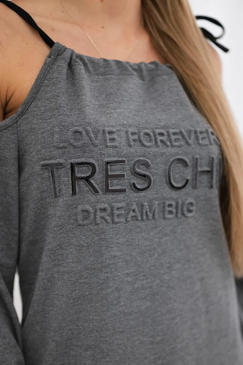 Prezentujemy Państwu wygodną sukienkę z napisem Tres Chic. Sukienka wykonana jest z wysokiej jakości materiału. Rozmiar jest uniwersalny i będzie odpowiedni dla Pań noszących rozmiar S, M lub L.