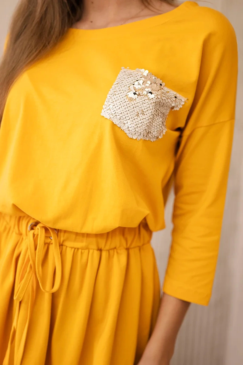 Kieszonka pokryta cekinami. Sukienka posiada wiązanie w pasie.