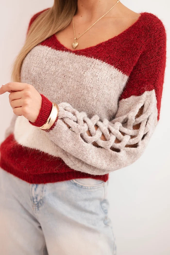 Sweter damski w pasy z warkoczami na rękawach to ciepła i stylowa propozycja na chłodniejsze dni. Miękki materiał otula ciało, zapewniając wysoki komfort noszenia, a luźny krój gwarantuje swobodę ruchów. Dekolt w serek pięknie podkreśla szyję, natomiast ozdobne warkocze na rękawach dodają całości niepowtarzalnego uroku.
